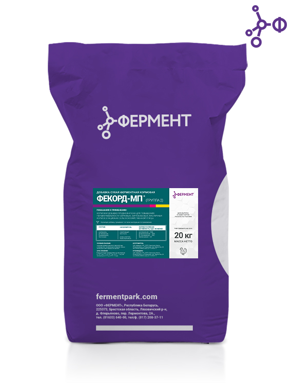| Добавка сухая ферментная кормовая Фекорд-МП | Мешок по 25 кг | Содержит ксиланазу, β-глюканазу, β- маннаназу, пектиназу (штаммы продуцентов – Trichoderma reesei, Trichoderma longibrachiatum, Bacillus lentus, Bacillus amydoliguefaciens, Pichia Pastoris), наполнитель (мука пшеничная или мука ржаная; композиция мел-соль). | Для повышения перевариваемости зерновых, зернобобовых, масличных кормов в рационах сельскохозяйственной птицы | В закрытой таре при температуре хранения от −10°С до +25°С – 1 год, от 0°С до +8°С – 2 года |