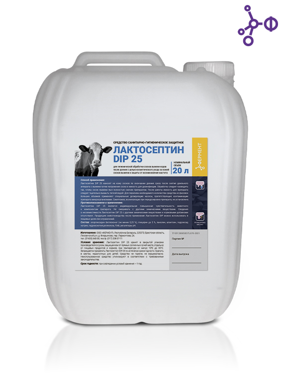 Sanitary and hygienic protective agent "Lactoseptin DIP 25" by Ferment OOO (hereinafter - the agent) is intended for hygienic care of the skin of udder milk tubes and protection from caked udder in animals between milking. This product is specifically designed for dairy farms oriented at production of high quality milk and preservation of productive longevity of cows.
