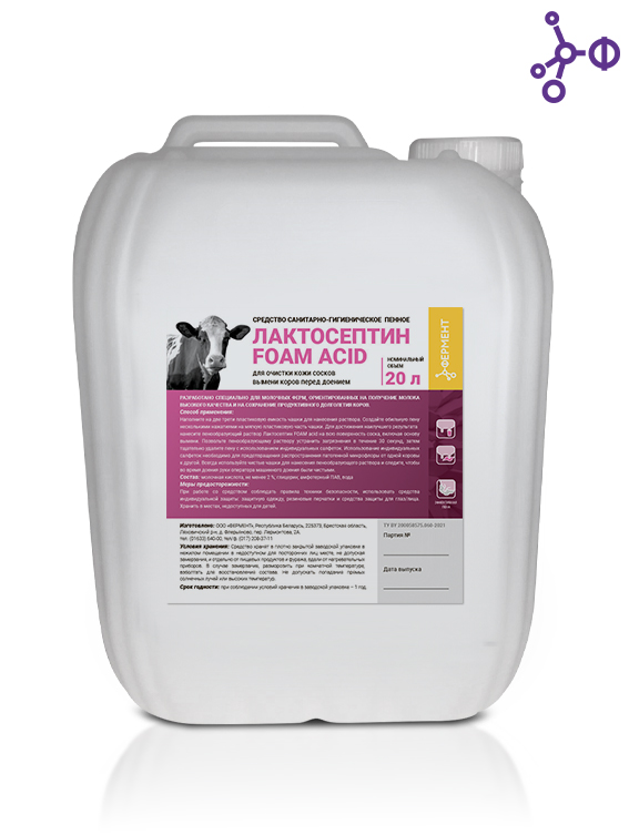 Sanitary and hygienic foam-forming agent "Lactoseptin FOAM acid" by Ferment OOO (hereinafter - the agent) is intended for skin cleaning of milk tubes of cow udders before milking. This product is specifically designed for dairy farms oriented at production of high quality milk and preservation of productive longevity of cows.